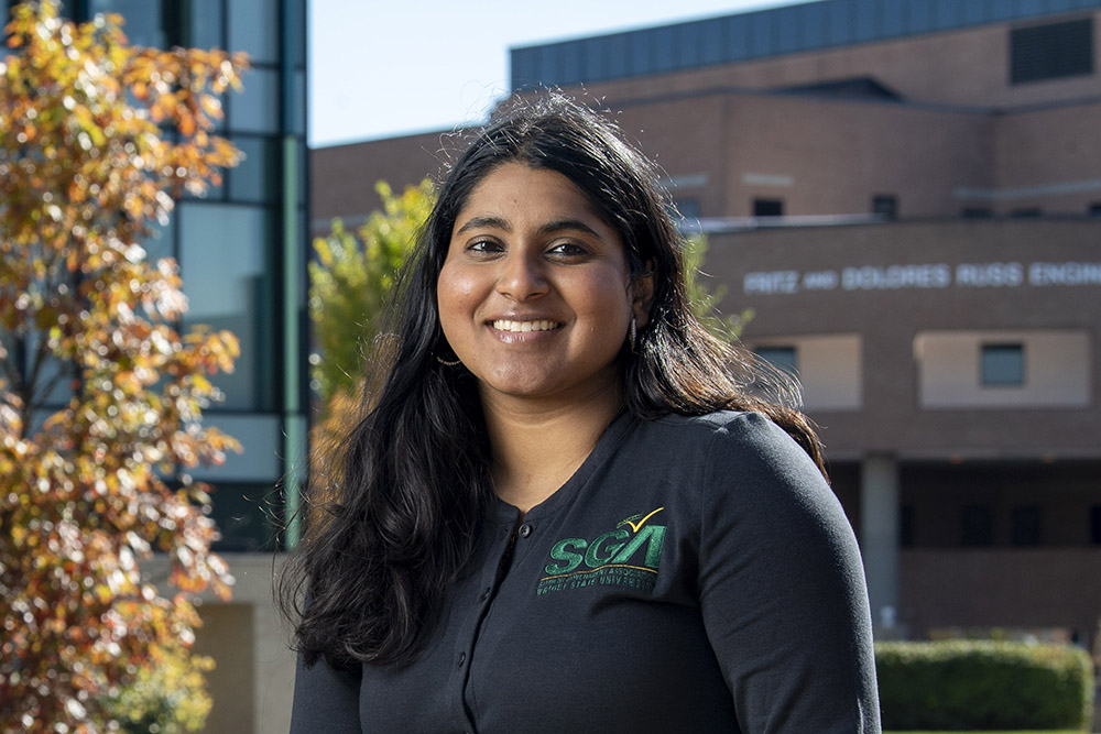 Wright State biomedical engineering major Shloka Ravinuthala leads the Student Government Association with empathy and a commitment to amplifying student voices across campus. (Photo by Erin Pence