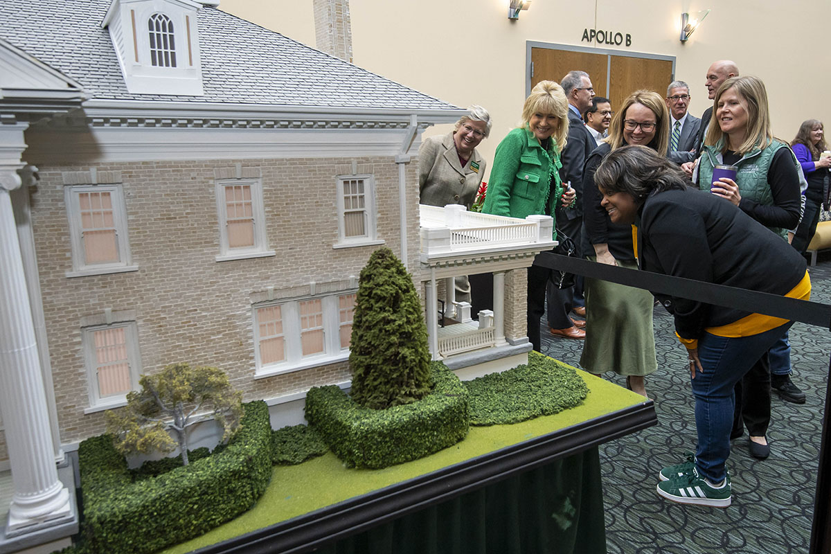 Wright State staff examine the newly donated replica of Hawthorn Hill, the Wright brothers’ historic home, which was recently donated to the university. (Photos by Erin Pence)