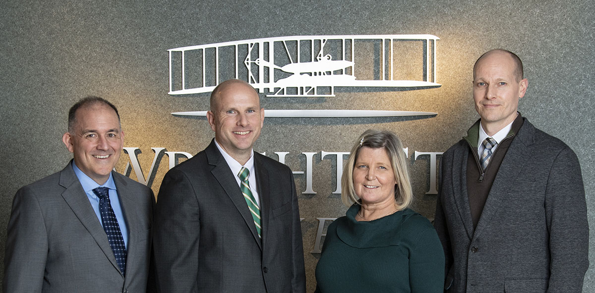 From left, Wright State’s Center for Civics, Culture and Workforce Development staff members Mike Jacobs, deputy director; Jason Anderson, executive director; Diane Vitas; and Adam Reiman, deputy director. (Photo by Erin Pence)