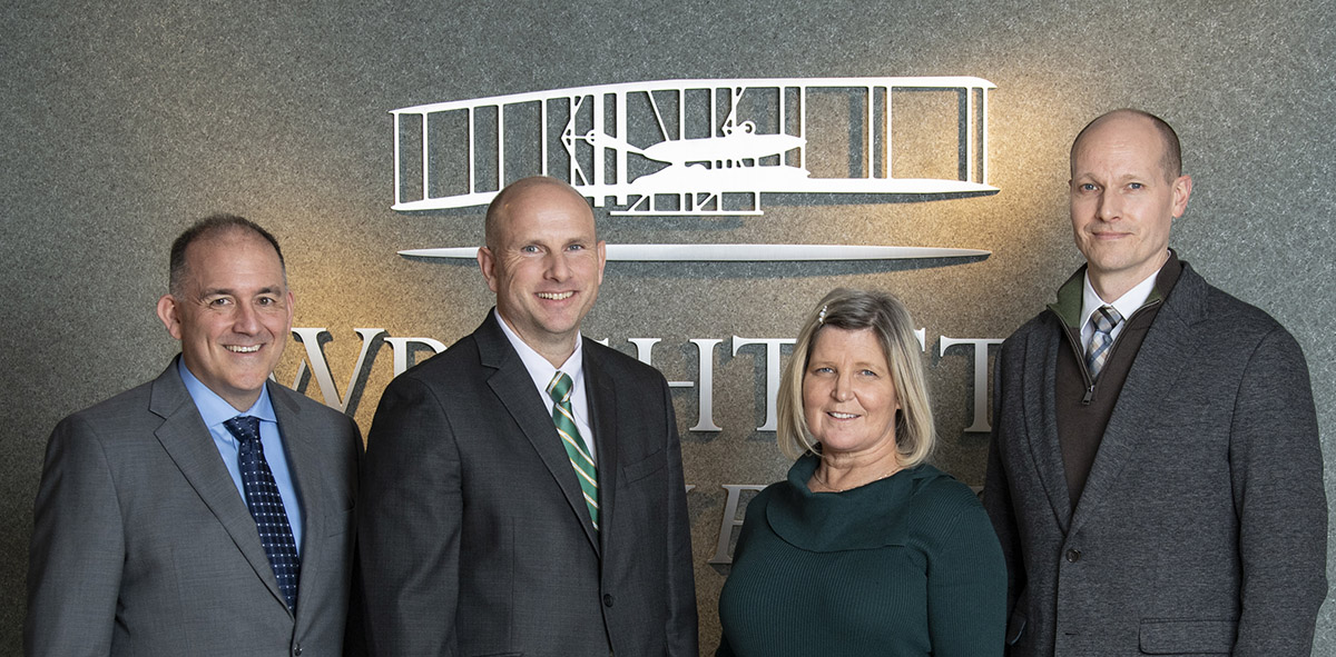 From left, Wright State’s Center for Civics, Culture and Workforce Development staff members Adam Reiman, deputy director; Jason Anderson, executive director; Diane Vitas; and Mike Jacobs, deputy director.