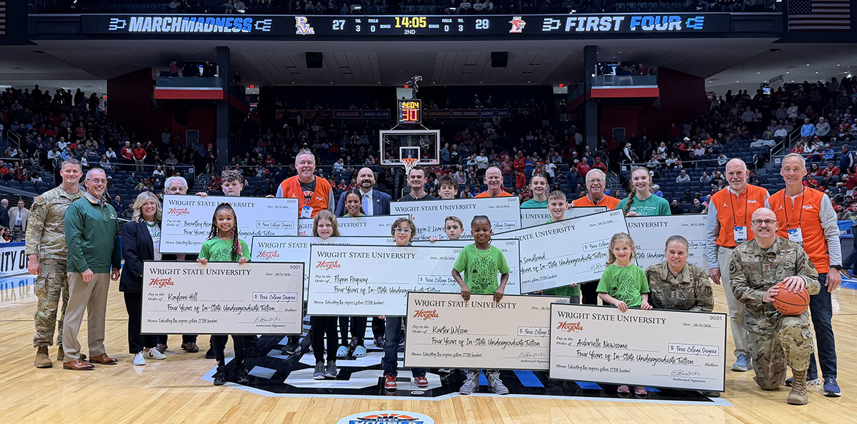 Students hold full-tuition scholarship checks on the court at the University of Dayton Arena during halftime of a NCAA First Four game on March 18, where Wright State University and the Big Hoopla recognized the STEM Challenge winners.